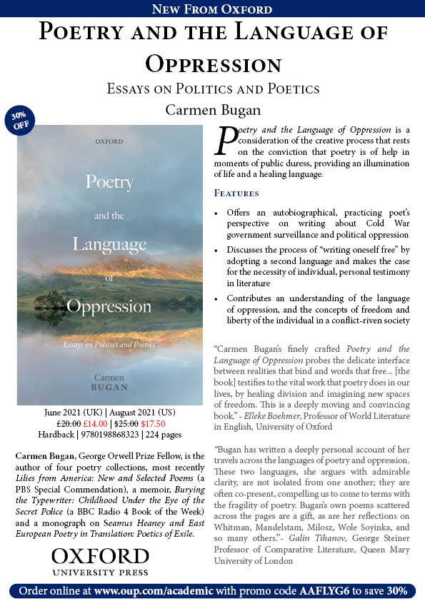 Poetry and the Language of Oppression: Essays on Politics and Poetics Posted on April 8, 2021April 8, 2021 by carmenbugan Share this: Click to share on X (Opens in new window) X Click to share on Facebook (Opens in new window) Facebook Like Loading... Related