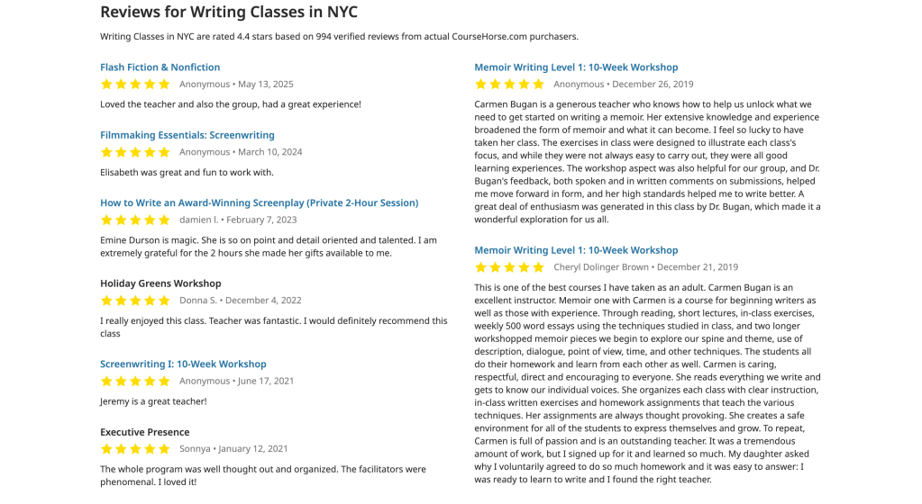 Instructor is highly skilled in language, writing (across genres) and everything attached to the written/spoken word that feeds creative expression. Her background is extensive, and she is operating at the highest level in the world of arts and letters. She brings all of this to the class. Her sensibilities are keen. GWW is lucky to have a poet and instructor of her level. What I appreciated most was her breadth of knowledge about poetry, the smart design of the course, her choices of examples for each topic in her syllabus and her ability to convey the ideas and art with each example.–Gotham Writers’ Workshop, Poetry II, 10 week course, 2026