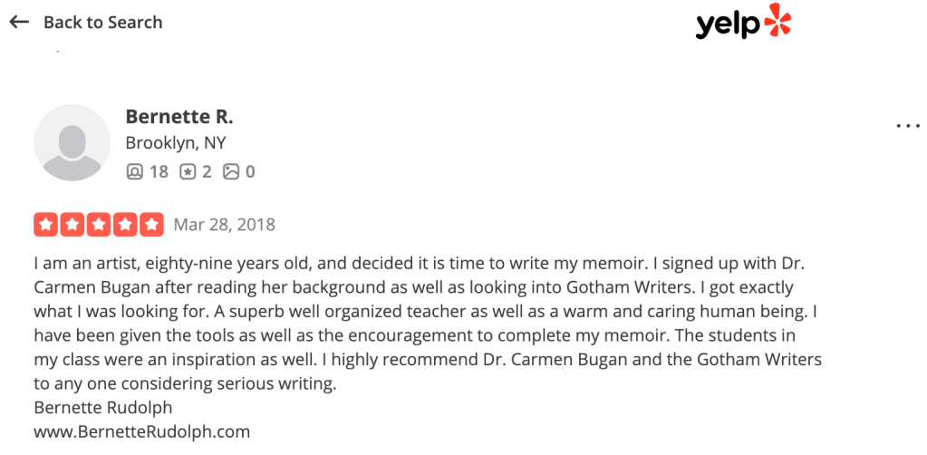 Carmen Bugan is such a gift as an instructor! She is kind, interesting, intelligent, and completely understands all the ins and outs of memoir writing. Best of all, she is able to articulate her knowledge clearly and concisely while still making every class fun as well as informative. She quickly worked to know us as writers and made the learning process relevant to each of us, and her wry sense of humor brought each session to life in the most enjoyable way. One of my favorite things about the course is how we all worked together to make class time a safe space to share our most personal writing together; we all had an attitude of support and growth thanks to the expectations Carmen set for us.–Gotham Writers Workshop, Spring 2026